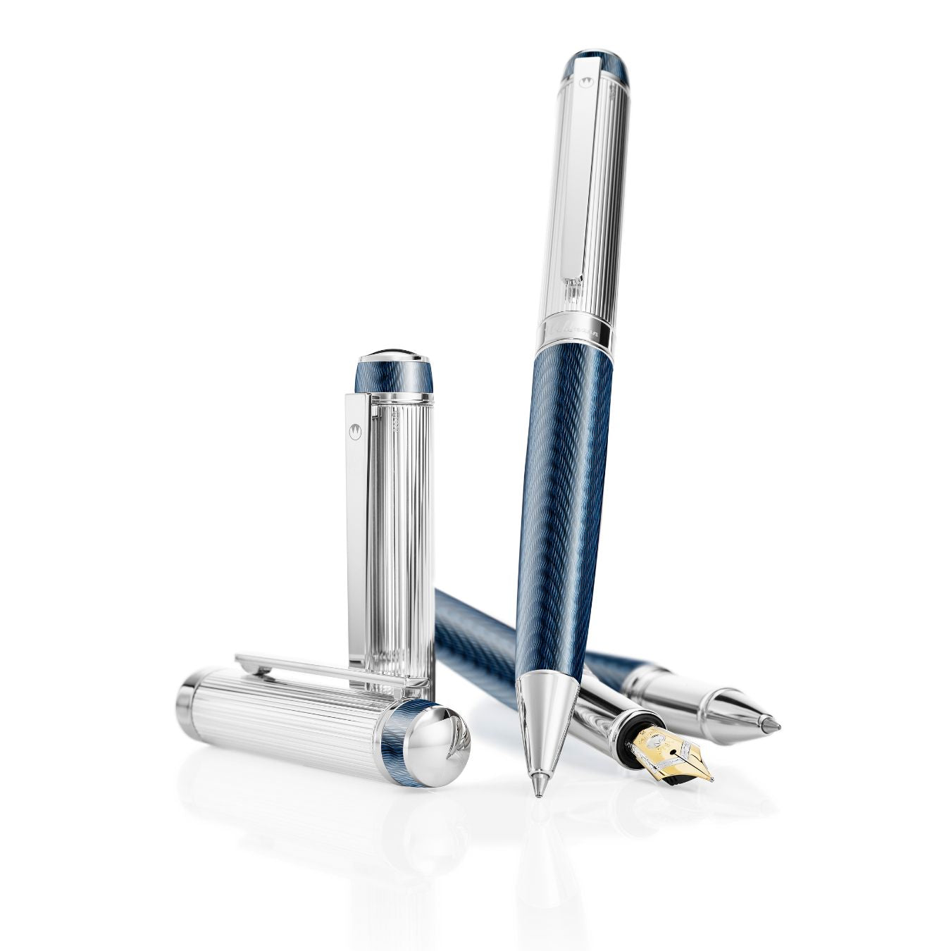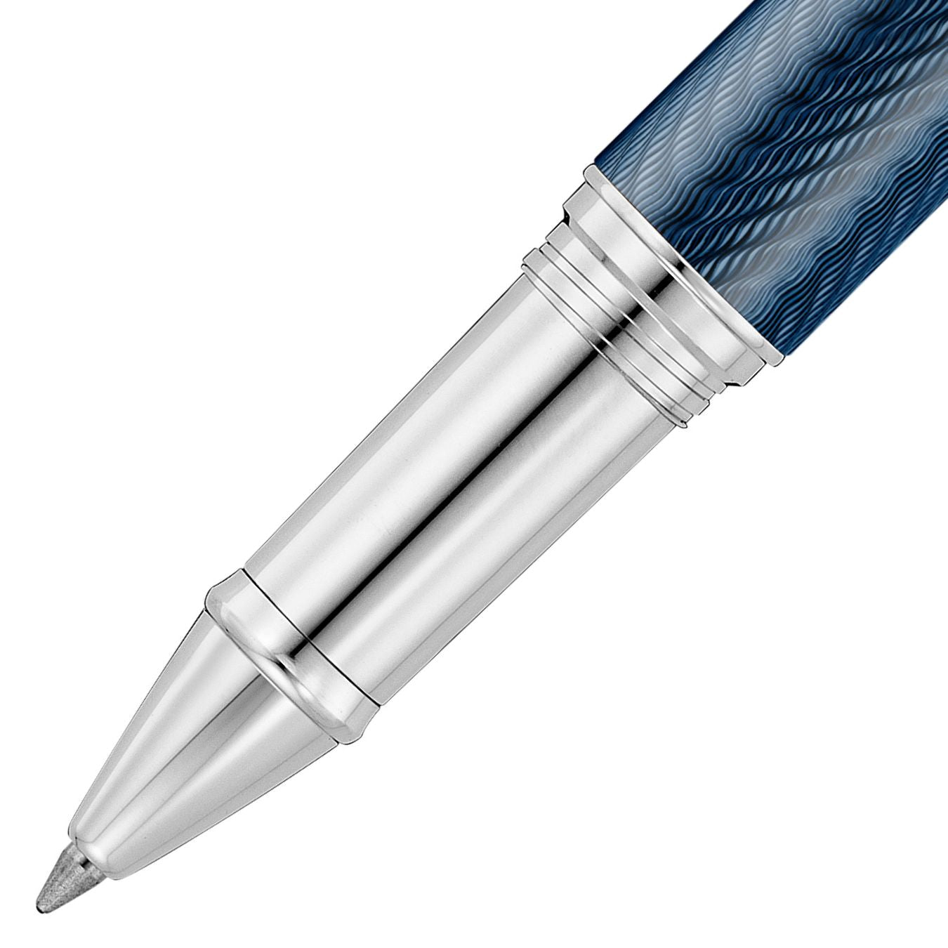 Der Waldmann Grandeur Ocean Blue Rollerball Pen ist ein prächtiges und anspruchsvolles Schreibgerät, das Würde und Erhabenheit ausstrahlt. Es ist beeindruckend und monumental in seiner Erscheinung und weist zugleich feine und dekorative Details in seiner Handwerkskunst auf. Die Kappe weist ein klassisches Nadelstreifenmuster auf, das mit der traditionellen Guilloché-Technik erstellt wurde. Schaft und oberer Ring sind mit einem eleganten Wellenmuster verziert, das ebenfalls sorgfältig in Guilloche-Technik gefertigt wurde. Der Stift ist mit einem mehrschichtigen transparenten ozeanblauen Lack veredelt, der ihm eine tiefe, faszinierende Farbe verleiht. Er verfügt über einen soliden, federgestützten Clip für sicheren Halt, und die Metallteile sind elegant platiniert. Die Kappe verfügt über ein sicheres Schraubsystem. Erleben Sie den außergewöhnlichen Schreibgenuss dieses wahrhaft grandiosen Tintenrollers.