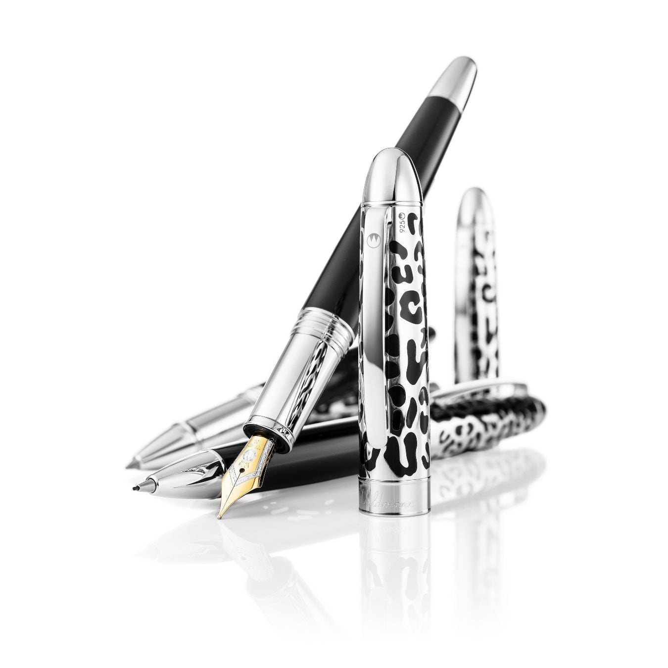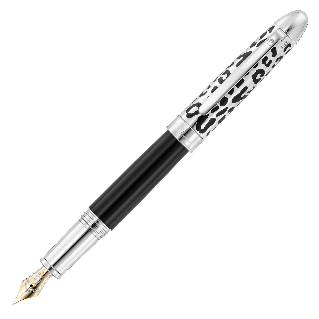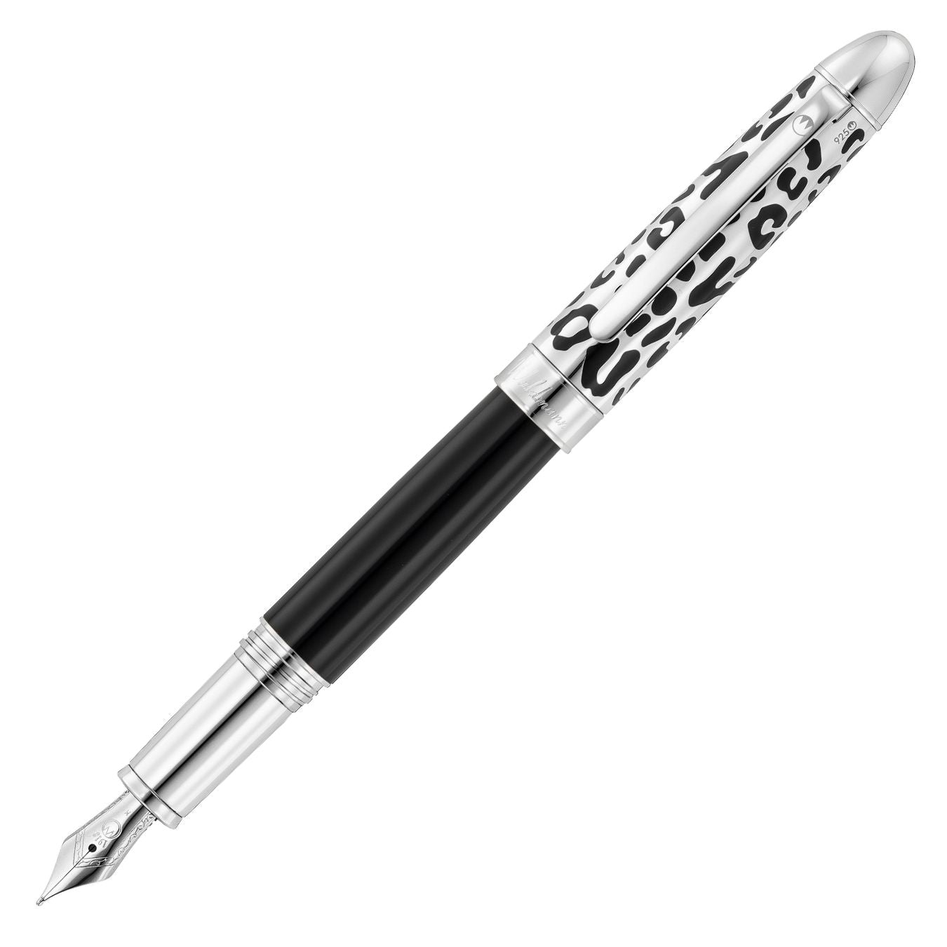 Die Kappe ist mit einem kunstvoll gravierten Leopardenmuster verziert, mit sattem Schwarzlack überzogen und auf Hochglanz poliert. Der Schaft ist mit mehrschichtigem, brillantem Schwarzlack versehen und für tiefen Glanz ebenfalls hochglanzpoliert. Die Einzelteile bestehen aus Metall mit einer edlen Platinbeschichtung. Ein stabiler, federgestützter Clip sorgt für sicheren Halt.