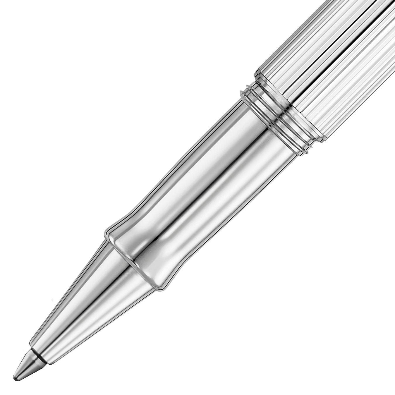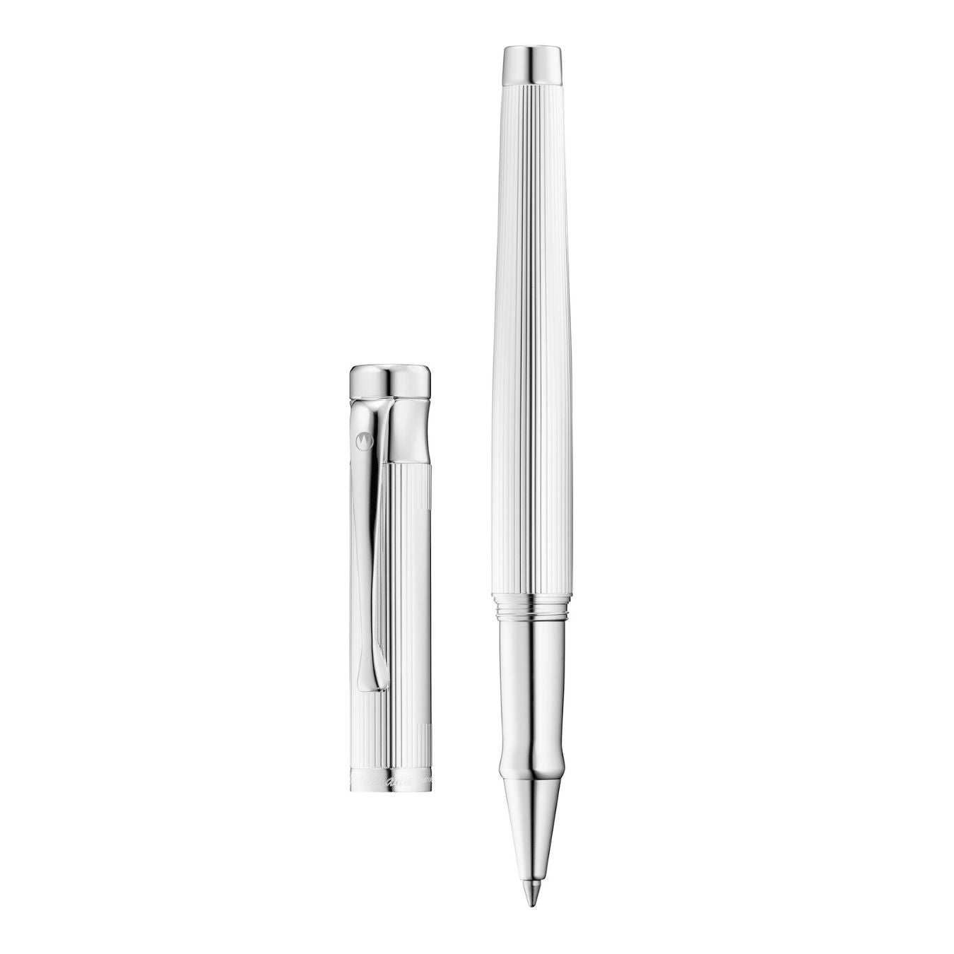 Der Waldmann Tango Silver Lines Tintenroller: Ein echter Erfolgstyp und Designklassiker, sofort erkennbar an seiner ausdrucksstarken, konischen Silhouette. Kappe und Schaft zeichnen sich durch ein raffiniertes Linienmuster aus, das sorgfältig in traditioneller Guillochiertechnik gefertigt wurde. Er ist mit einem robusten Stahlclip ausgestattet, und die Einzelteile sind elegant platiniert. Das sichere Schraubverschlusssystem sorgt dafür, dass der Stift auch bei Nichtgebrauch zuverlässig verschlossen bleibt. Erleben Sie das sanfte, mühelose Gleiten dieses legendären Tintenrollers.