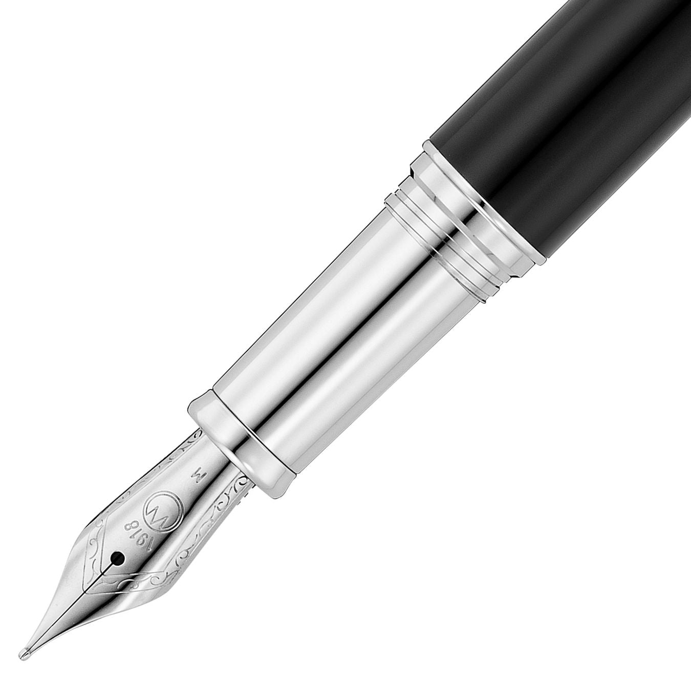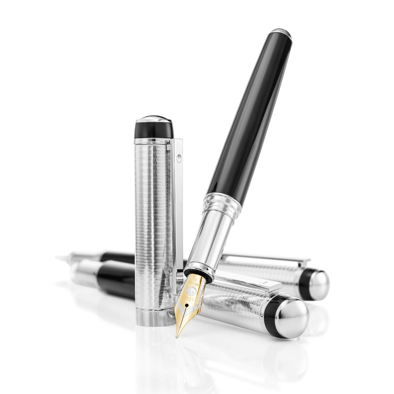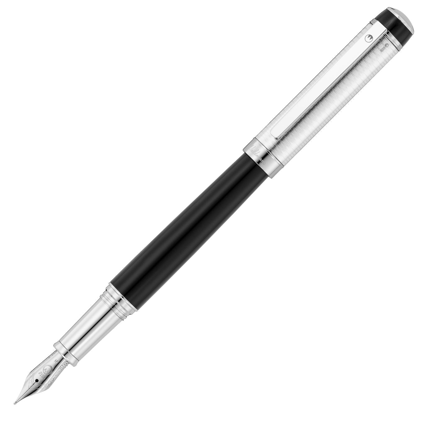 The Waldmann Grandeur Black Fountain Pen lives up to its name, embodying magnificent sophistication and commanding presence. Impressive and monumental in its overall appearance, it simultaneously reveals delicate and ornamental details in its craftsmanship. The cap is adorned with a classic pinstripe pattern, meticulously created using the traditional Guilloché technique. The shaft and top ring feature a multi-layered brilliant black lacquer finish. It boasts a solid, spring-supported clip for secure carrying. The metal component parts are elegantly finished in platinum plating. This fine writing instrument is equipped with a reliable iridium-tipped stainless steel or 18ct. gold nib and features a secure screw-cap system.