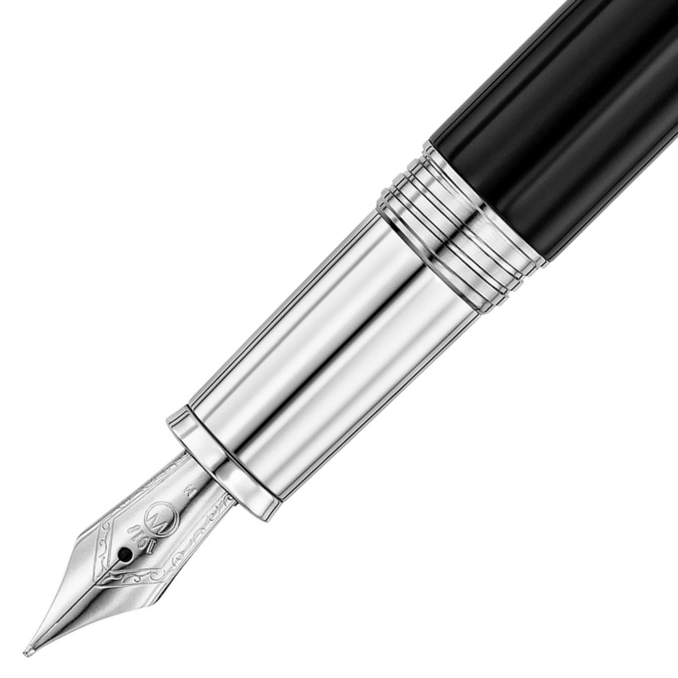 The pen is fitted with an iridium-tipped 18ct. -750 gold nib, available in a striking bicolor finish or a sleek stainless steel option, providing a smooth and luxurious writing experience. The cap features a reliable screw system for secure closure. This Précieux fountain pen is a testament to exquisite craftsmanship and timeless design.
