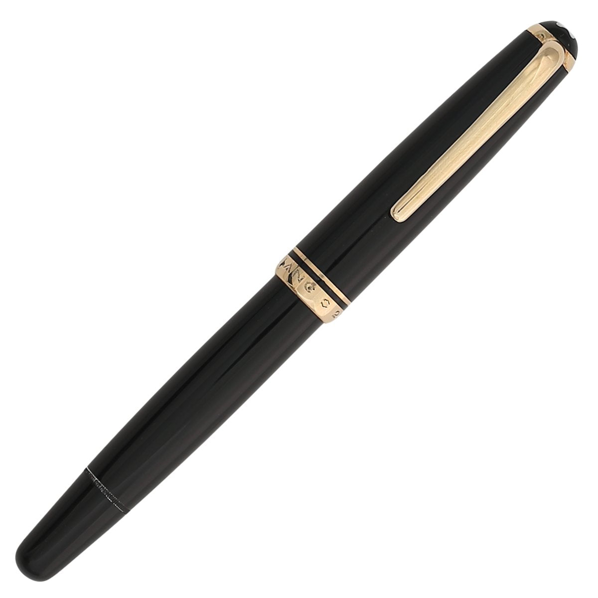 The pen features a sleek, deep black precious resin body accented with elegant gold-plated trim. The iconic Montblanc star emblem crowns the cap, signaling the pen's heritage and timeless quality. Its streamlined design and balanced feel make it a comfortable and reliable writing companion.