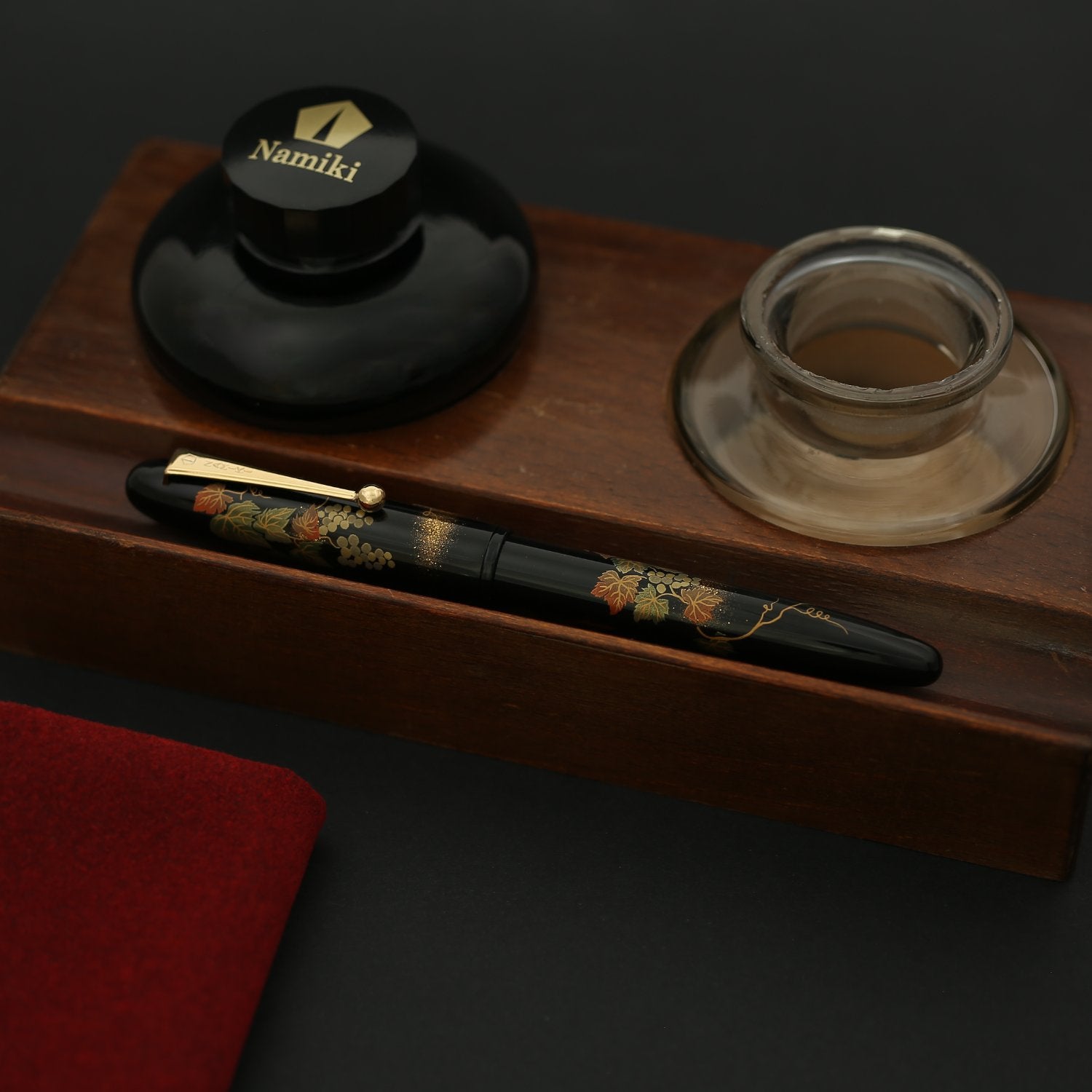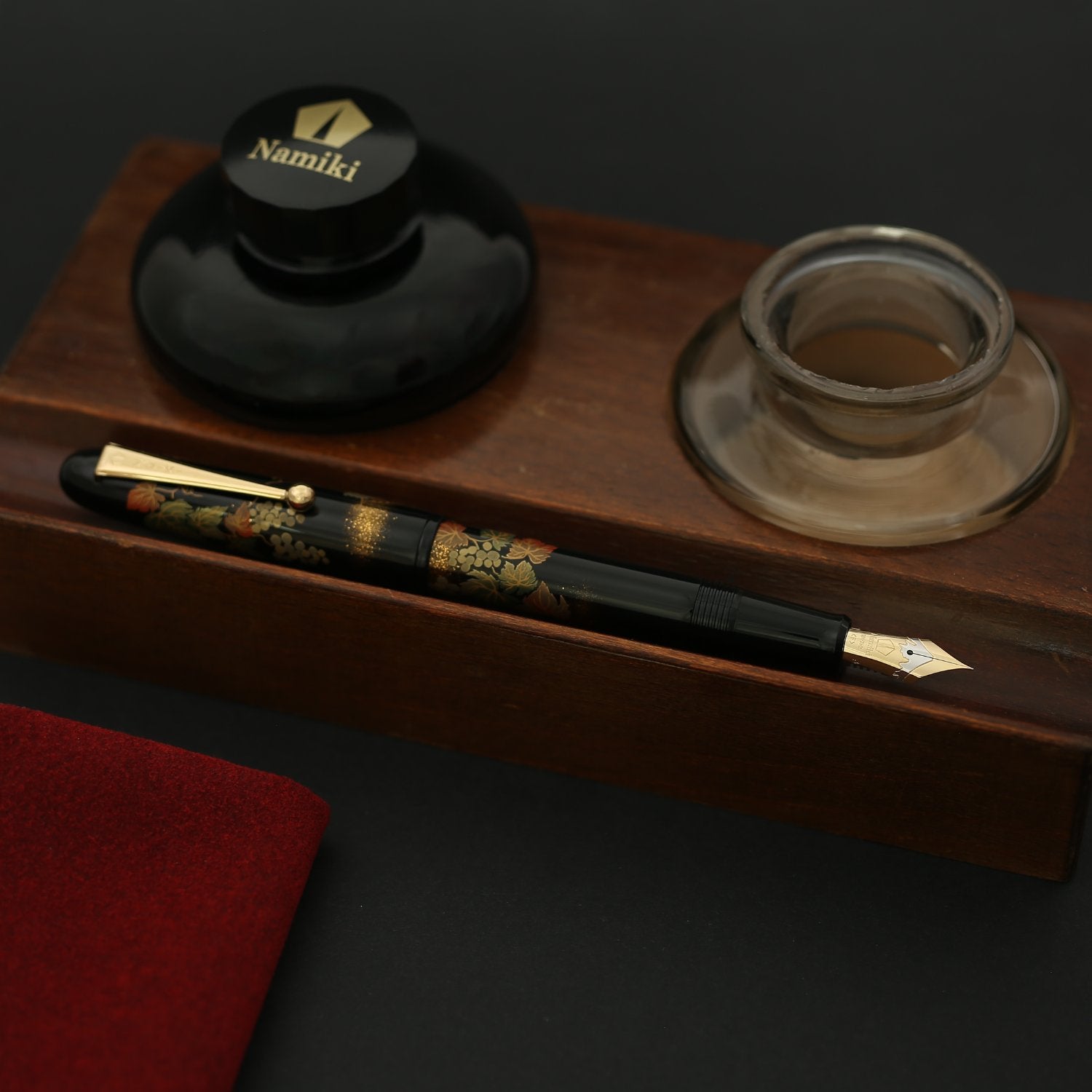 Immerse yourself in the exquisite beauty and unparalleled craftsmanship of the Namiki Yukari Grapevine Fountain Pen. This exceptional pen is a testament to the time-honored traditions of Japanese Maki-e artistry, meticulously handcrafted by the skilled artisans of Kokkokai.