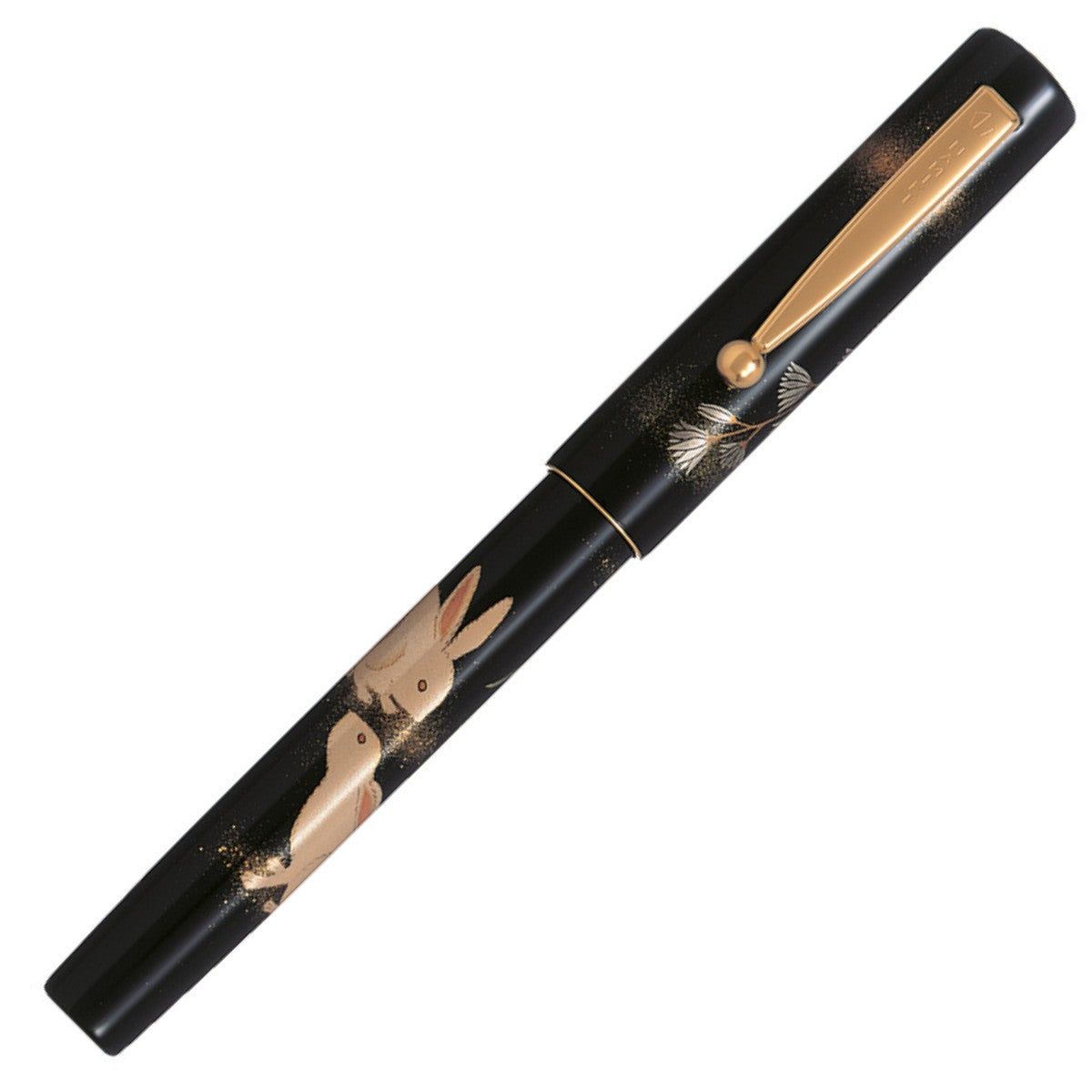 The pen’s barrel is meticulously adorned with a traditional Maki-e lacquer design, a revered Japanese art form where intricate patterns are created by sprinkling gold and silver powders onto wet lacquer. This painstaking process brings the graceful rabbit to life, capturing its serene movement among lush flowers and natural elements.