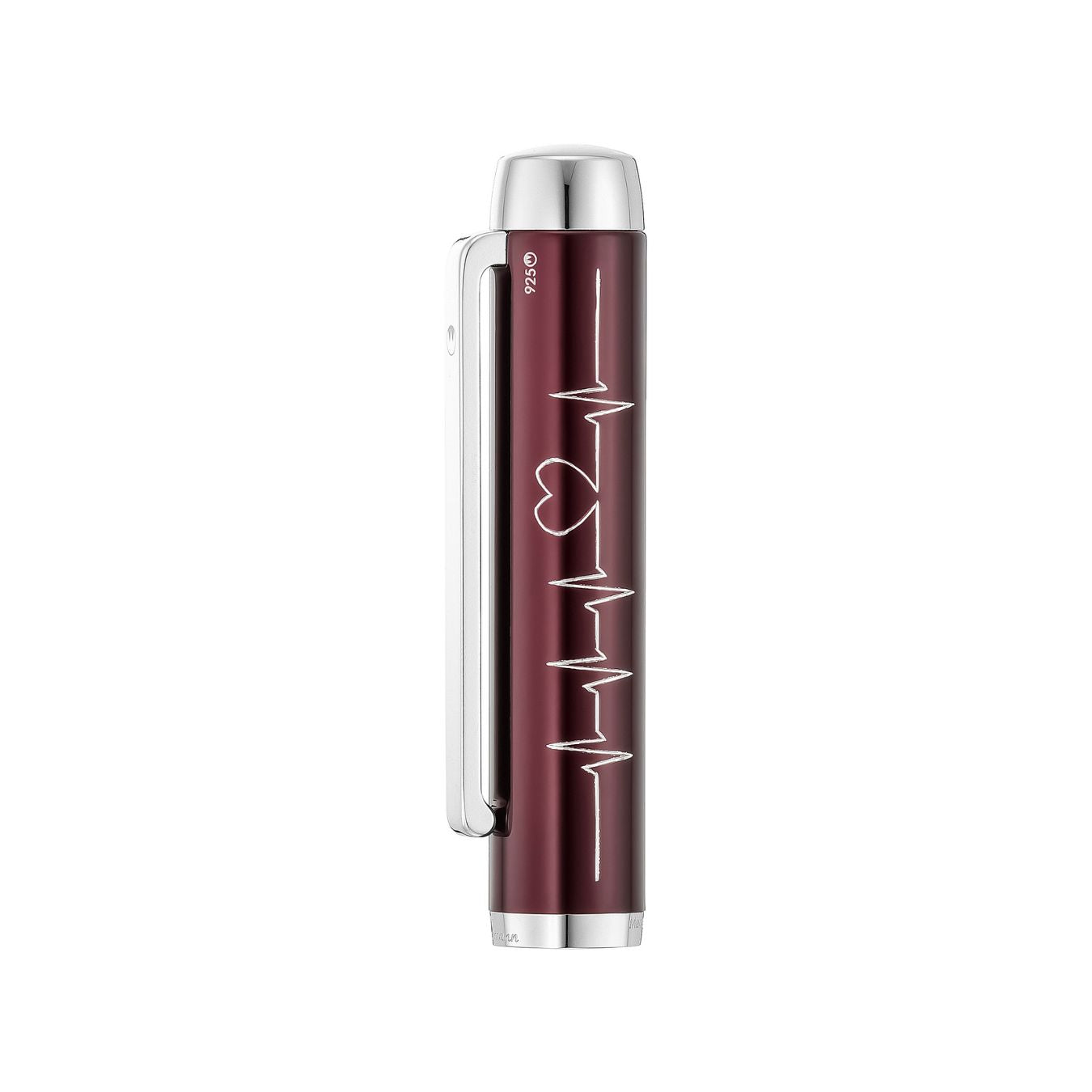 The cap and shaft are meticulously multi-layered lacquered in a vibrant blood-red hue, creating a striking and memorable aesthetic. The cap is further adorned with a delicate, hand-engraved heartbeat curve, a unique detail that speaks to the pen's evocative name.