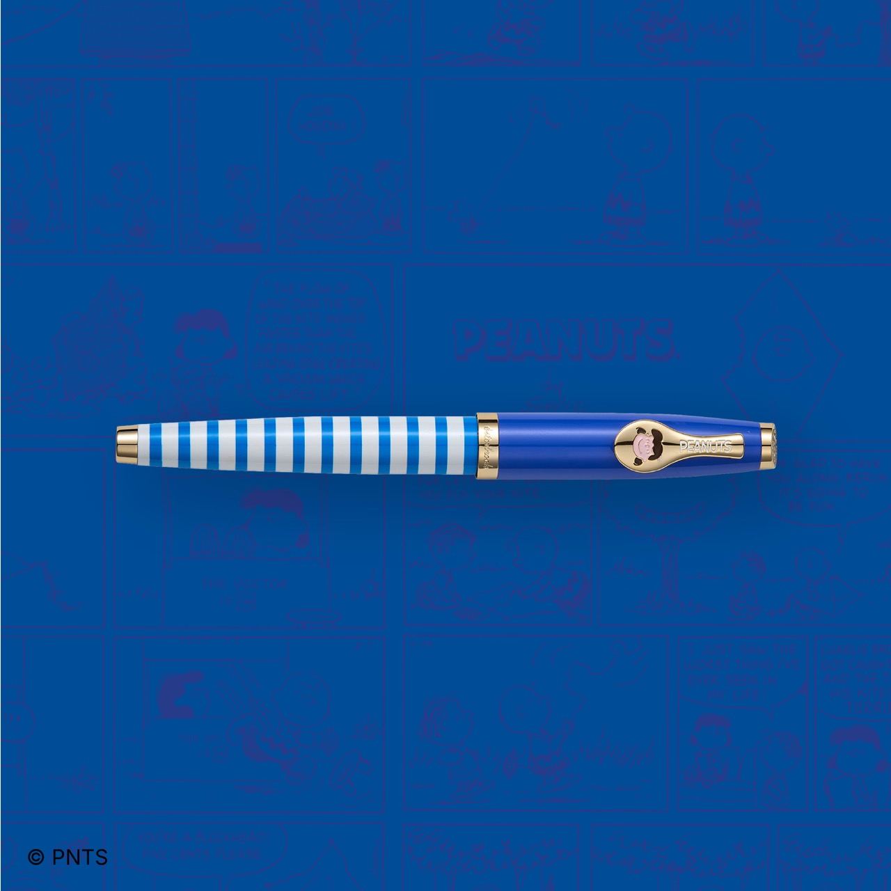 Lucy van Pelt’s bold, no-nonsense personality comes to life in this sleek blue Esterbrook pen. Perfect for running her psychiatry baooth or jotting down plans to take charge of the playground. Choose a fountain pen in Medium or Fine with a “Good Grief” engraved nib, or a ballpoint for quick notes with attitude. Each set includes a cloth inspired by Lucy’s classic outfit, and carries with it a bit of her...ahem, "charm".