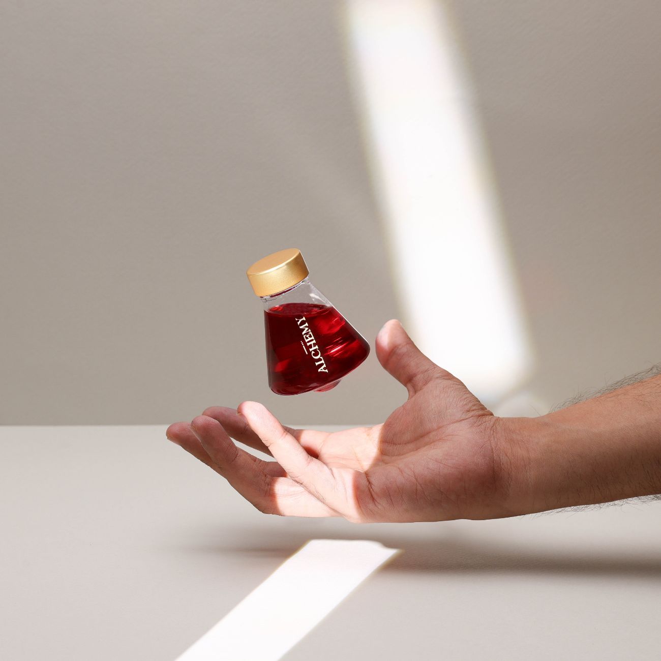 La botella "Alchemy": Una pieza central para cualquier escritorio. Cada botella de vidrio de 45 ml cuenta con una base de corcho de diseño personalizado que garantiza estabilidad y un estilo artesanal distintivo.